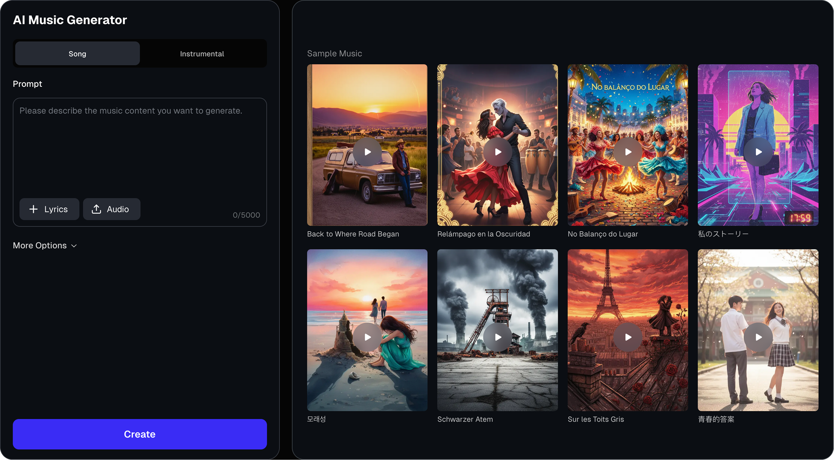 Créez des chansons complètes, des instrumentaux, des hooks et des audio prêts pour bandes originales à partir de prompts, de paroles ou d'audio de référence. Un clic, une minute, des résultats de qualité studio.