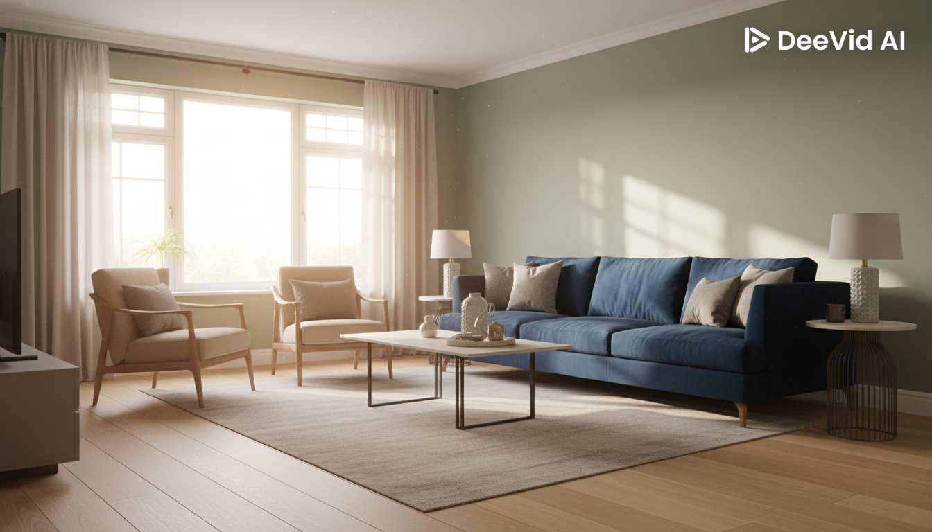 Prompt: “Take this living-room image. Replace the floor with light oak planks, switch the sofa to deep-blue velvet, change wall paint to muted sage, morning sunlight through west-facing windows; then generate an alternate version with warm evening lighting and the same furniture.”