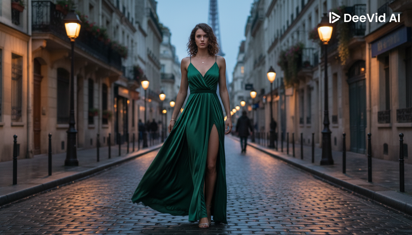 Prompt: “Use this model image; change the jacket to forest-green satin, place her on a cobbled city street at dusk with neon signs; then another version as a desk figurine toy with soft box lighting and pastel background.”